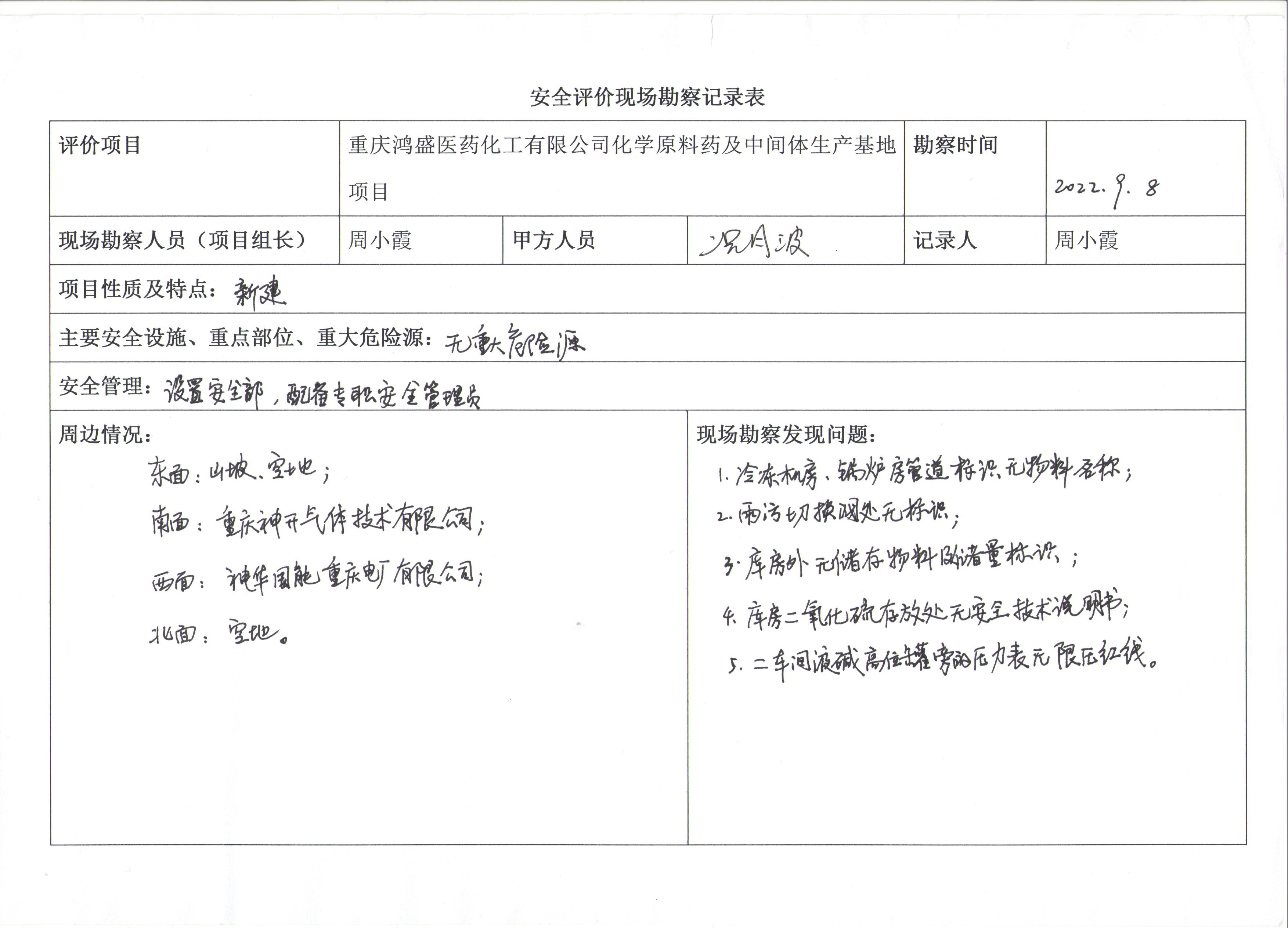 項目名稱 | 重慶鴻盛醫(yī)藥化工有限公司化學原料藥及中間體生產(chǎn)基地項目安全驗收評價 | 合同編號 | DA(渝)-PJ-2021010 | |||||