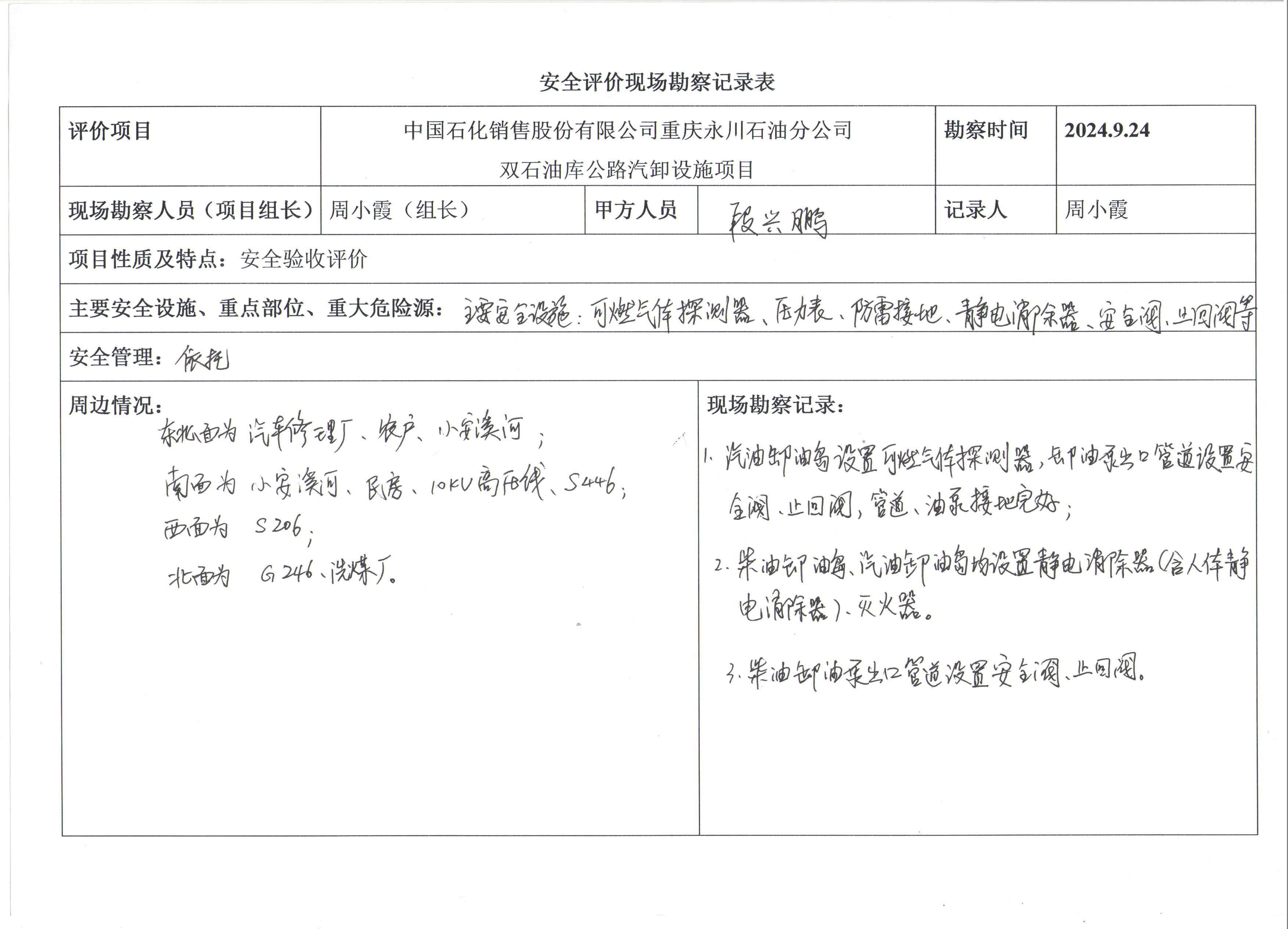 現(xiàn)場勘查情況 | 公路汽卸設(shè)施(柴油卸油島、汽油卸油島)安全設(shè)施和安全管理符合安全生產(chǎn)條件。 | |||||||
