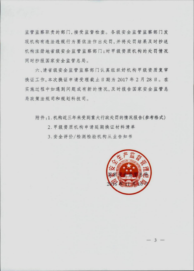 《國家安全監(jiān)管總局關(guān)于安全評價(jià)與安全生產(chǎn)檢測檢驗(yàn)機(jī)構(gòu)甲級資質(zhì)延期換證有關(guān)工作的通知》