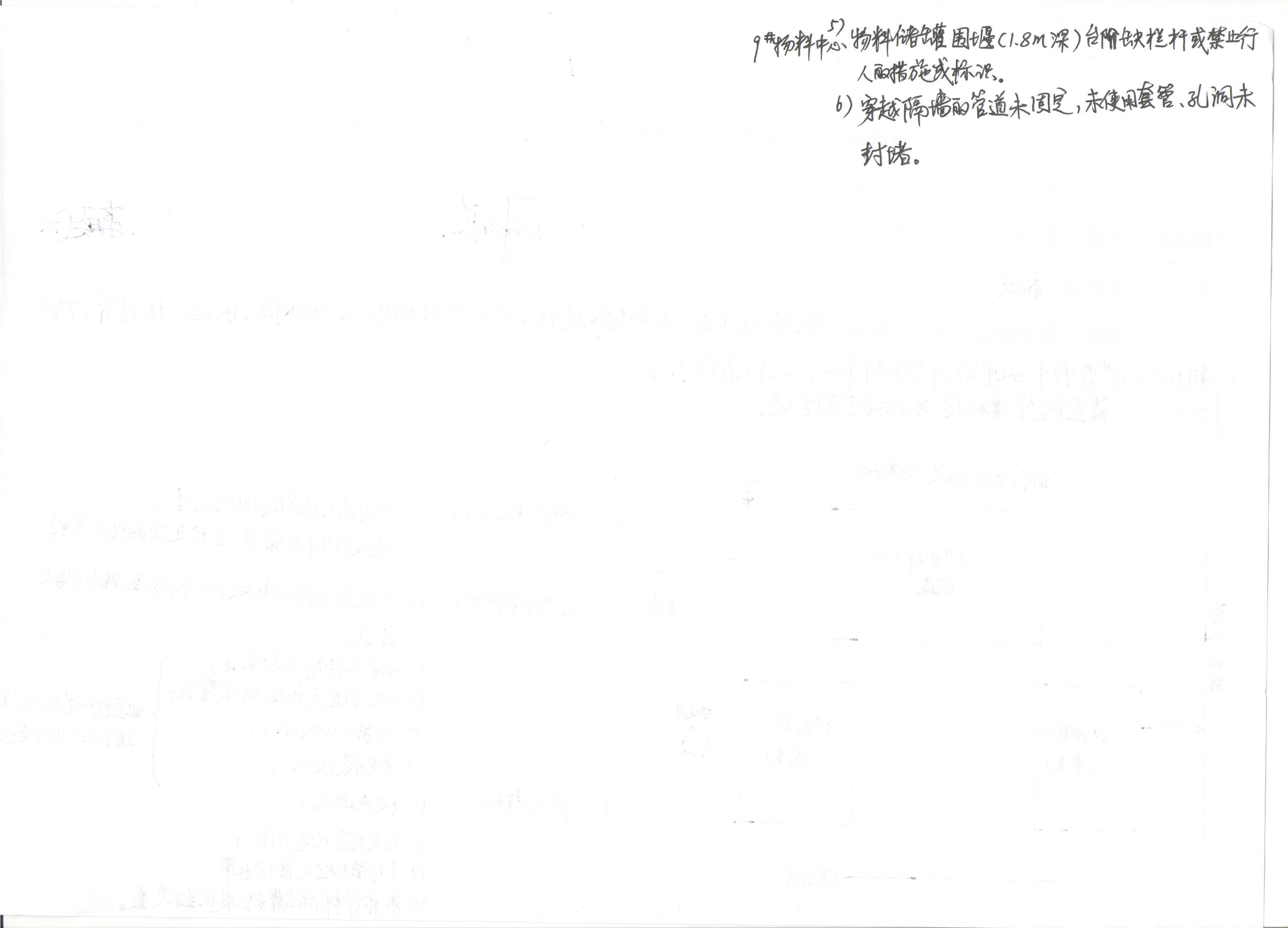 隱患: (1)7#物料中心(丙類)個別消火栓被雜物遮擋。 (2)7#物料中心(丙類)堆放物料與墻壁、立柱之間的距離不夠。 (3)無禁止煙火標(biāo)識。 (4)無滅火器檢查記錄。 (5)個別消火栓無水帶。 (6)9#物料中心(戊類)液體物料儲罐無液位顯示裝置。 (7)9#物料中心(戊類)進入圍堰的臺階邊緣無欄桿,圍堰缺乏禁止通行措施或警示標(biāo)識。 (8)9#物料中心(戊類)穿越隔墻的管道未固定,未使用套管,孔洞未封堵。 | ||||||||