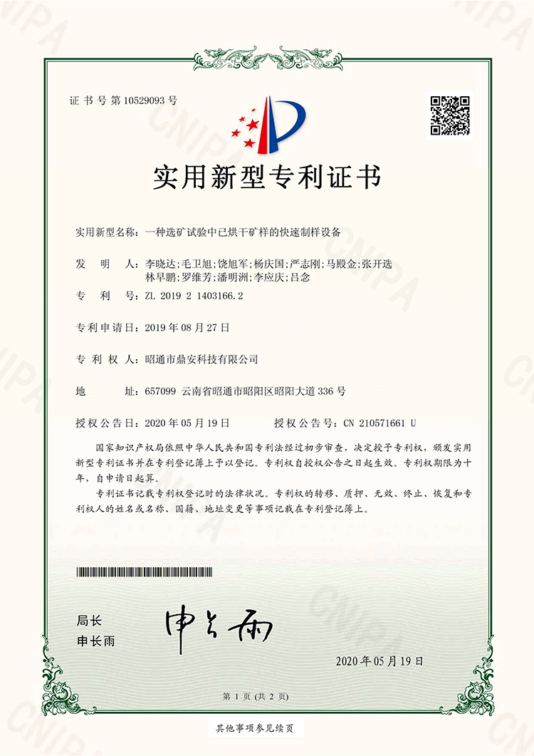 10529093一種選礦試驗(yàn)中已烘干匡洋的快速制樣設(shè)備20200519實(shí)用新型專(zhuān)利證書(shū)