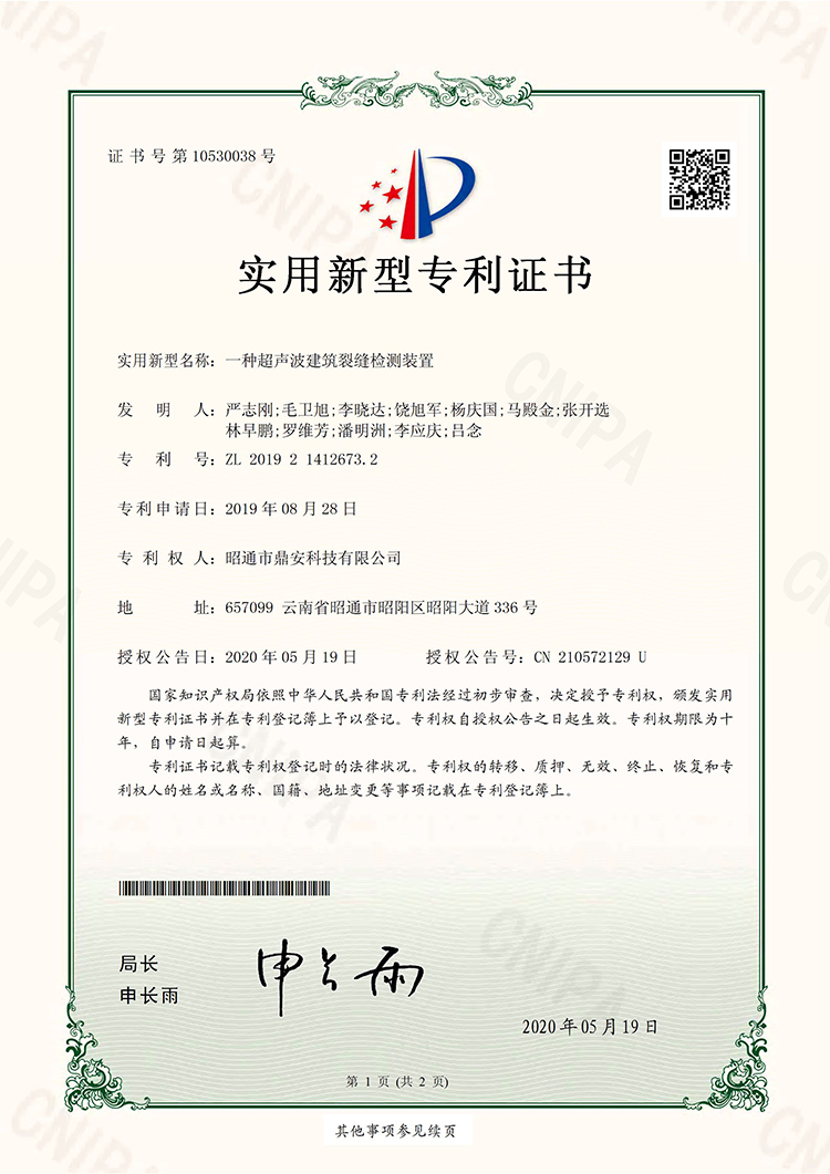 10530038一種超聲波建筑裂縫檢測(cè)裝置20200519實(shí)用新型專利證書